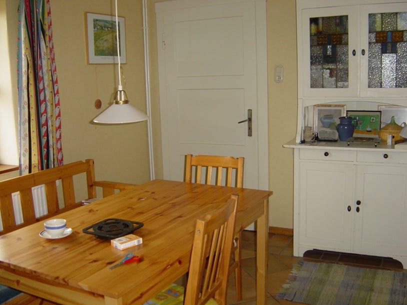 Der Esstisch lässt sich auf 200 cm verlängern; dann haben an ihm bis zu acht Personen Platz, zwei bis drei davon auf einer langen Sitzbank. Vorhanden sind auch vier unterschiedliche Kinderhochstühle, siehe hier.