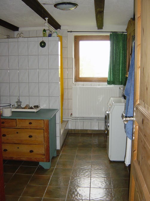 Im Erdgeschoss liegt das geräumige B a d mit einer großen gemauerten Dusche. Hier befindet sich auch die Toilette.