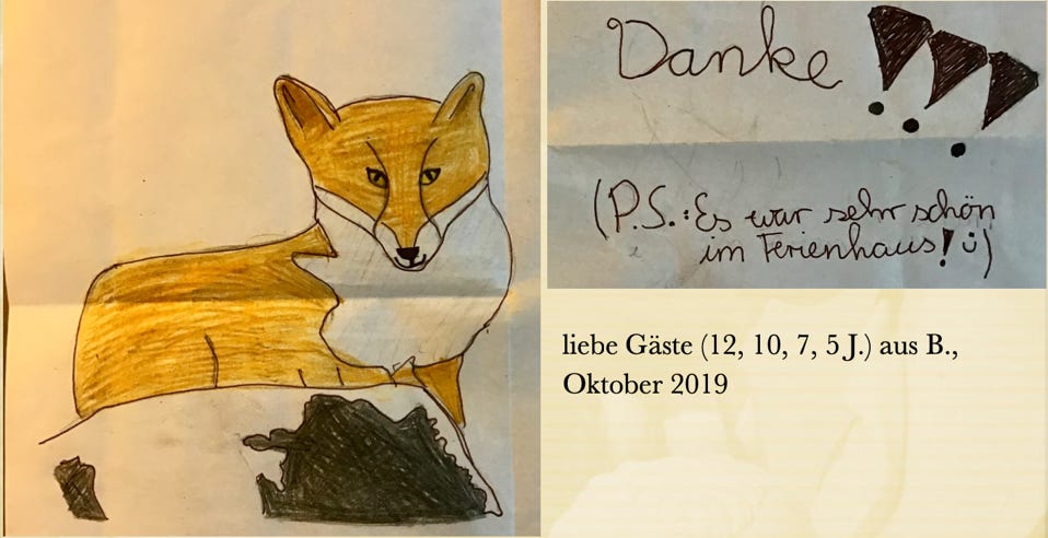 "es hat uns wirklich ganz toll in Ihrem Haus gefallen! (Auch wenn das Wetter hätte perfekter sein können.) Die Kinder haben im Garten getobt und die Tierwelt genossen. Sie fanden es übrigens gar nicht so kalt. Wir haben Fledermäuse, die Nachbarskatze, einen Fuchs im Garten, auf dem Feld Rehe und Kraniche gesehen. Es war ein wunderschönes entspannendes Naturerlebnis.